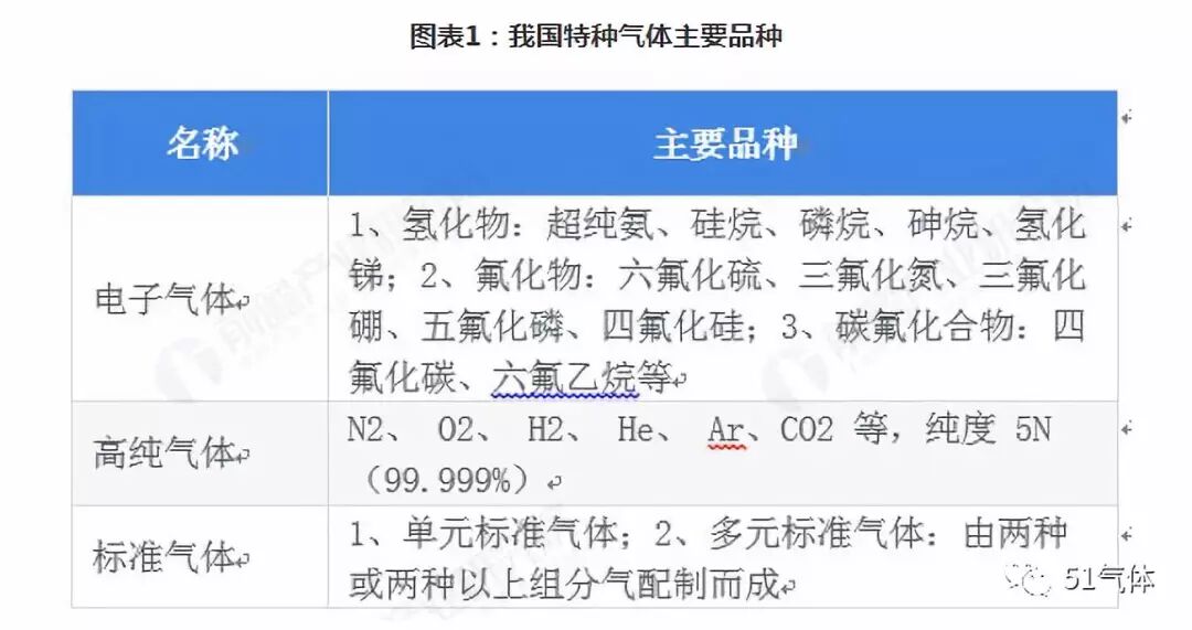 特种气体是工业气体中的一个新兴门类,是随着近年来国防工业、科学研究、自动化技术、精密检测,特别是微电子技术的发展而发展起来的。近年来,随着下游应用领域的逐步扩展,特种气体的品种也与日俱增,据不完全统计,现有单元特种气体达 260 余种,特种气体已成为高科技应用领域不可缺少的基本原材料。特种气体从应用领域上分为:电子气体、高纯气体、 标准气体。随着非低温气体分离技术(吸附、膜分离)、混配技术和提纯技术的发展,更多的特种气体产品将逐步走向市场。