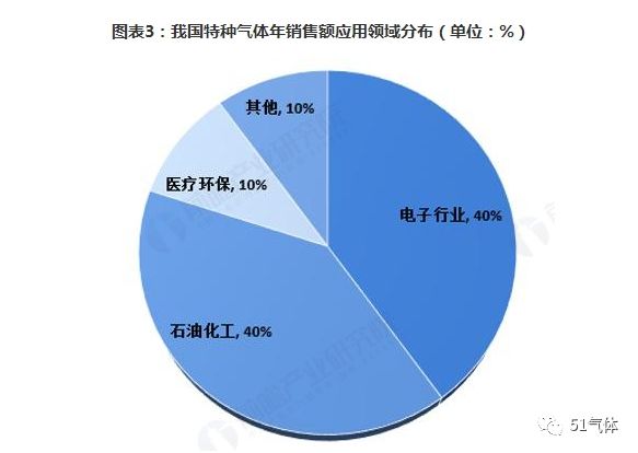 据相关数据统计,目前,在我国特种气体年销售额中,电子行业约占40%,石油化工约占40%;医疗环保约占10%,其它约占10%。