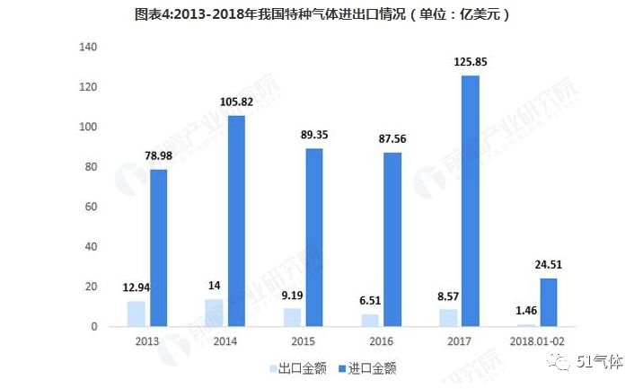 从特种气体进出口金额来看,我国特种气体主要以进口为主,进口金额远远超过出口金额,截止2018年2月,我国特种气体进出口金额分别为24.51亿美元、1.46亿美元。
