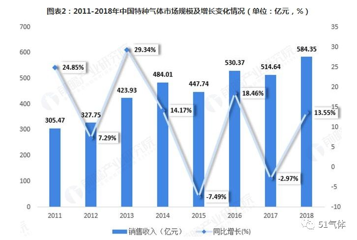 随着中国经济的快速发展,特种气体在国民经济中的重要地位和作用日益凸显。主要体现在炼油行业、冶金行业、电子器件、环保产业。从我国特种气体市场规模来看,整体上呈现上涨趋势,2017年我国特种气体市场规模514.64亿元,同比下降2.97%,初步估算2018年我国特种气体市场规模达到584.35亿元,同比增长13.55%。