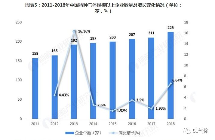 中国的特种气体企业市场规模普遍不大,大多数企业为中小型企业。从企业性质来看,在中国气体行业中占据重要地位的是三资企业和民营企业。截至2017年底,我国特种气体行业规模以上企业数量达到211家,较上年增加4家。保守估计2018年我国特种气体企家数量为225家。
