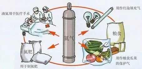 自氮气被发现后,科学家们做了大量实验,得到了液态氮;同时,他们把氮气运用到工业、农业、国防以及日常生活中。比如农业上使用最多的便是氮肥;用氮气填充粮仓,可使粮食不霉烂,不发芽。再如,博物馆的贵重字画,可保存在充满氮气的密封容器中,以防蛀虫,避免氧化。再如,在医疗上,作为深度制冷剂的液氮,可以冻死病变的细胞。而在工业上,由氮气制成的硝酸,是炸药的重要组成部分;钢经氮化后,钢的硬度、耐磨性都大大增强。