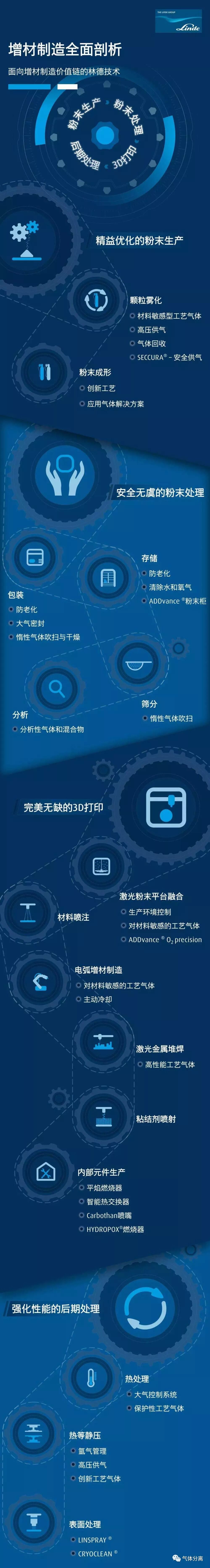 要实现以上方面的改善,除了依托设备、原材料等环节的不断发展,专业的工业气体供应以及生产气氛的精确调控同样构成了不可或缺的重要因素。在原材料粉末生产、安全处理、3D打印气氛控制、后处理等各个环节中,都需要对工业气体进行专业的供应和调控,从而确保3D打印及增材制造的产品品质、能效与安全性得到最大化的提升。