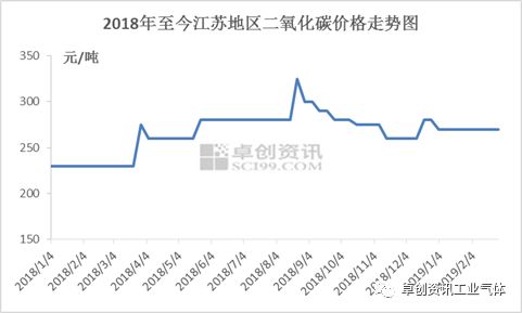 近年来江苏二氧化碳装置产能持续增长,截至2018年底,江苏省二氧化碳总产能已经突破200万吨,但是由于下游需求增速不及产能增速,因此一直处于供大于求的情况。据卓创了解,虽然去年由于部分企业上游气源供给不稳定导致江苏地区部分企业的二氧化碳装置开工率出现下滑,暂时缓解了江苏地区二氧化碳企业出货压力,部分企业价格也有小幅上涨,但是从整体来看,江苏地区供大于求严重、企业之间竞争激烈的局面短期之内恐难缓解。卓创预计,今年江苏工业级二氧化碳市场商谈价格或上涨不易,市场主流价格多在200-300元/吨之间震荡。