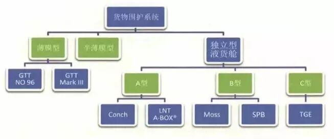 IGC规则要求气体运输船须建造成由双壳双底保护,设置专用液货舱装置:货物围护系统,包括主屏壁和次屏壁,以及附属的绝热层和屏壁间处所,还包括必要时用于支持这些构件的邻接结构。对LNG运输船,IGC规则定义了5种货物围护系统(见下图)可供选择,其中最常见的货物围护系统为GTT薄膜型和Moss球罐型