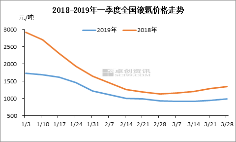 据上图所示,2019年一季度液氩走势与2018年相似,基本呈跌后小涨态势。受春节氛围影响,进入1月,厂商多选择降价排库,以减轻节日期间库存压力。节后,在下游需求尚未大面积开启之前,市场继续以降库存为主,多地价格呈下探态势。其中山东、河北等地降至550元/吨低点,广东跌至1350元/吨左右。直至3月中旬以后,随着天气转暖,需求升温,华东、华中、华南等地价格开启小幅推涨道路。据卓创数据监测, 2019年首季度全国液氩均价为1199元/吨,同比下降28.2%。