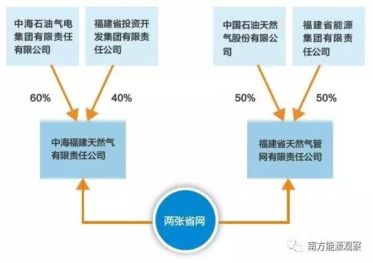 与中海油合资合作的省网公司叫做中海福建天然气有限责任公司,其股东为中海石油气电集团(占股60%)和福建省投资开发集团(简称福投集团,占股40%)。与中石油合资合作的福建省天然气管网公司,则分别由中石油和福建能源集团各占比50%组成。而福投集团和福能集团皆是福建省属排名前3位的国企。