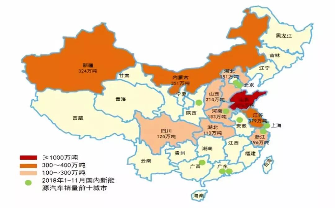 图表一:2018年国内烧碱产能≥100万吨的省份