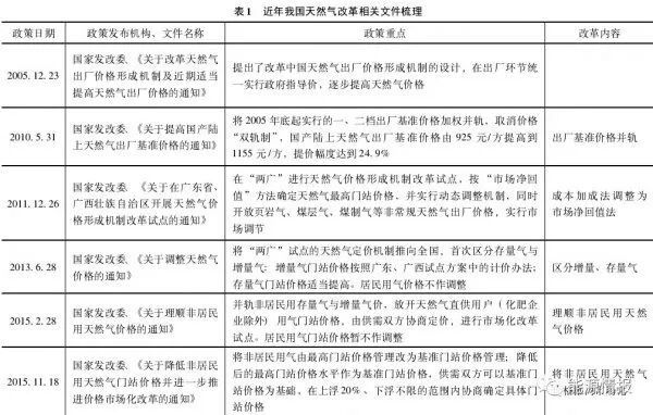 自2004年西气东输一线工程全线正式商业运营起,我国天然气市场便开启了十余年的改革之路,从上游勘探开发、中游管网输送、下游终端分配,天然气产业链进入了整体、快速的发展阶段。价格机制同样也在不断调整,笔者梳理了自2005年至今,我国颁布的各项关于天然气定价机制改革的重要文件。详见表1。