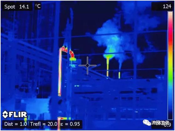 FLIR红外热像仪拍摄扫描区域的全景图像,在取景器或液晶屏上,气体泄漏区域会显示为一缕烟雾,帮助用户看到挥发性气体的泄漏。如下图: