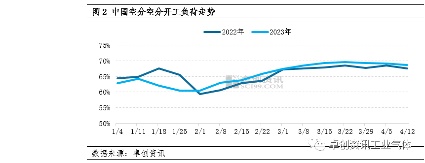 通过图2可以看出,3月份下旬,中国空分开工负荷率上升至高点,之后表现为微幅回降。主要原因在于3月底至今,华东包括长三角地区在内的空分装置检修增多,带动空分开工负荷率下降,液氮总供应量微幅收缩。但相较于需求弱势,供应的收缩并未对液氮价格形成利好。据卓创资讯数据监测,截至4月13日,中国空分开工负荷率至68.55%,环比下滑0.57个百分点。需求面来看,下游化工、电子等相关行业表现一般,长三角各地缺少批量采购,仅个别企业有临时性采购,且多以锁定用量的形势外采,对液氮价格难有带动。