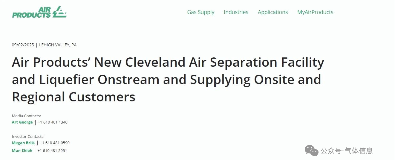 2025年9月2日,空气产品公司(Air Products)宣布其位于美国俄亥俄州克利夫兰的新建空气分离设施(ASU)已成功投产并投入运营。该设施由公司自主投资、建造及运营,具备液态气体生产能力。