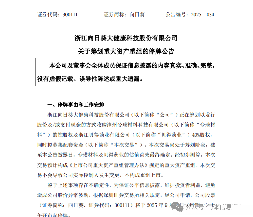 9月7日晚,药企向日葵发布关于筹划重大资产重组的停牌公告,拟跨界收购一家半导体电子特气企业。