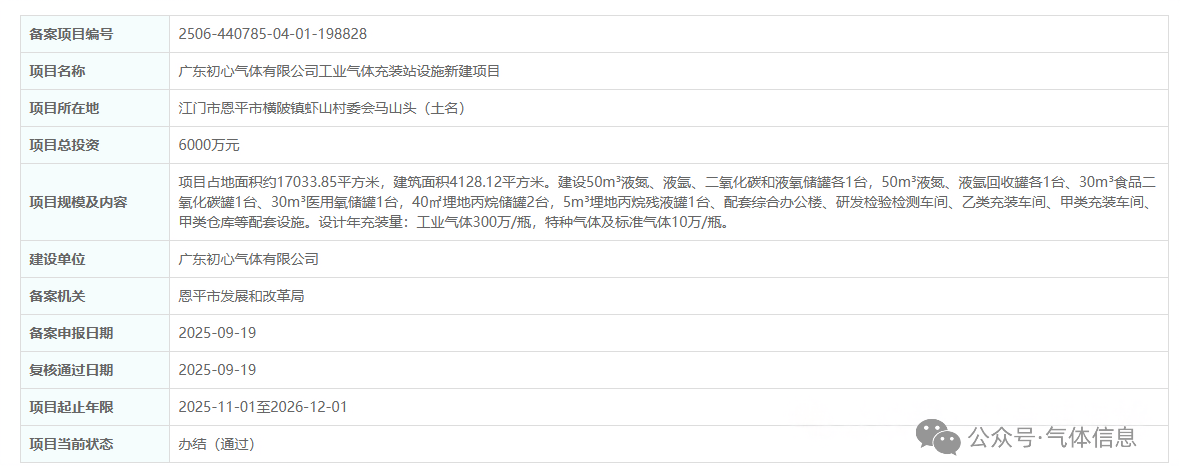 9月19日,广东初心气体有限公司工业气体充装站设施新建项目获备案。