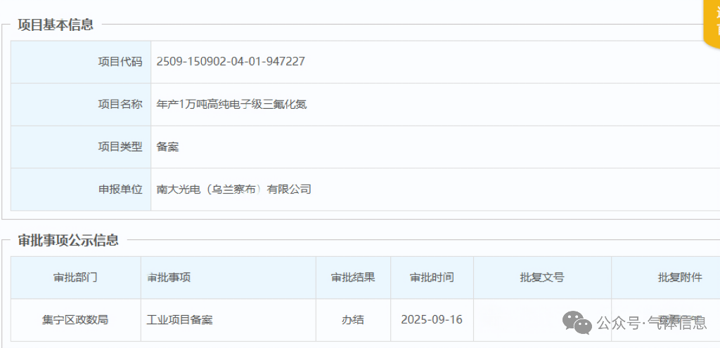 9月16日,年产1万吨高纯电子级三氟化氮项目获备案。