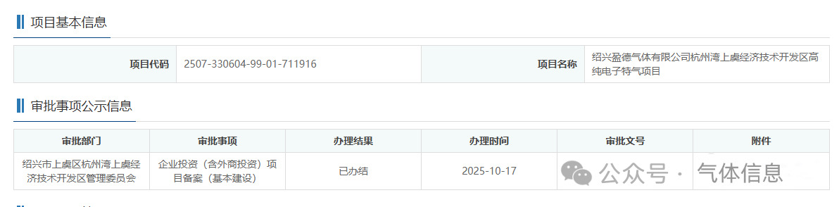 10月17日,绍兴盈德气体有限公司杭州湾上虞经济技术开发区高纯电子特气项目获备案。
