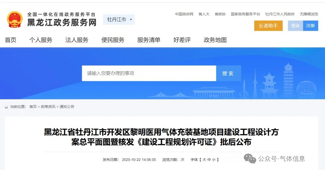 10月22日,黑龙江政务服务官网发布消息,黎明医用气体充装基地项目正式获批公示。该项目位于黑龙江省牡丹江市开发区,由牡丹江黎明医用氧气有限公司负责建设。