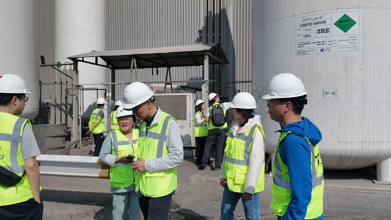 代表团首先走进位于迪拜的Gulf Cryo总部——这是一家在中东地区具有重要影响力的综合气体企业。代表团详细了解了企业在气体生产、充装、储运及应用端的布局,并就氢能、低碳发展等议题进行了深入交流。