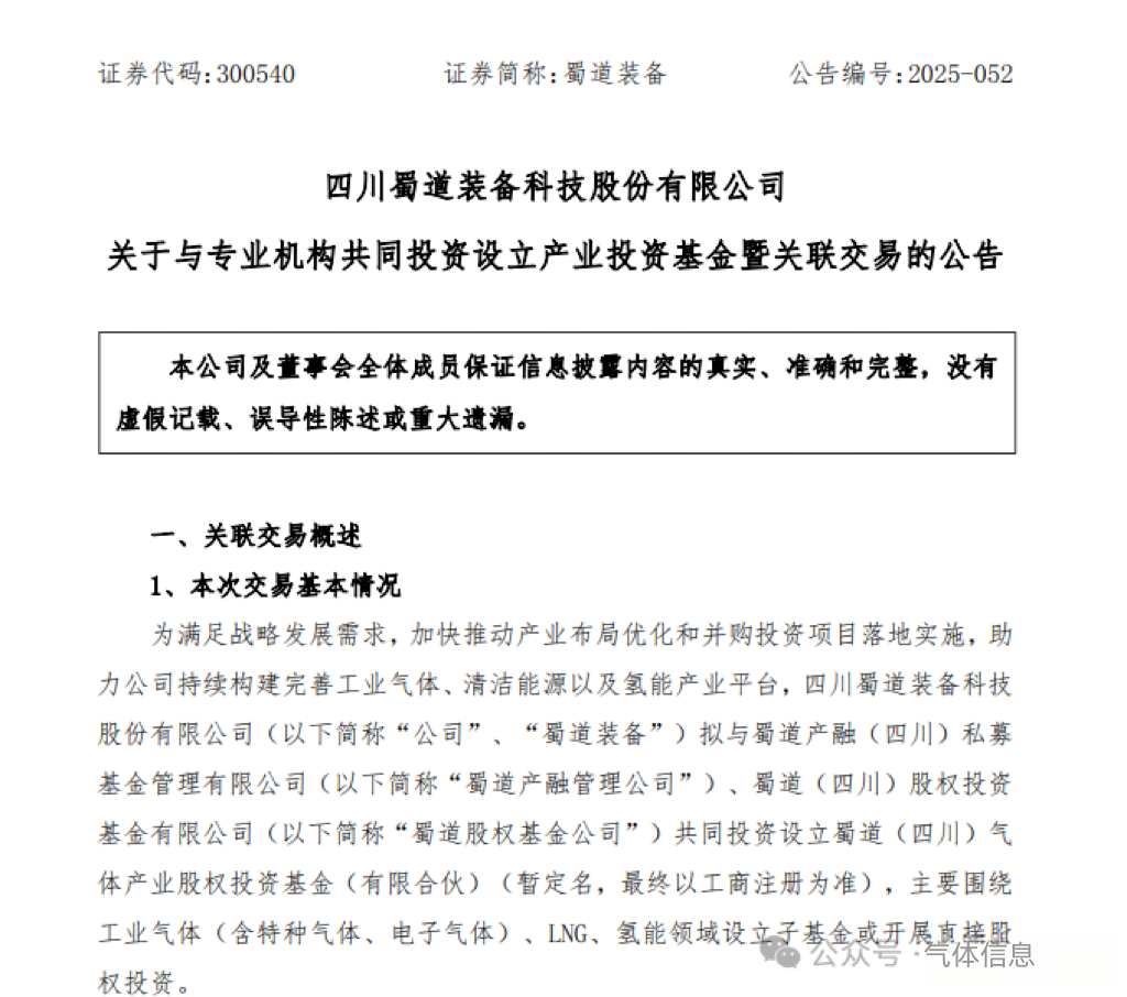 12月2日,蜀道装备发布公告称,公司拟与蜀道产融(四川)私募基金(蜀道产融)、蜀道(四川)股权投资基金(蜀道股权基金)共同投资设立蜀道(四川)气体产业股权投资基金(有限合伙)(暂定名)。主要围绕工业气体(含特种气体、电子气体)、LNG、氢能领域设立子基金或开展直接股权投资。