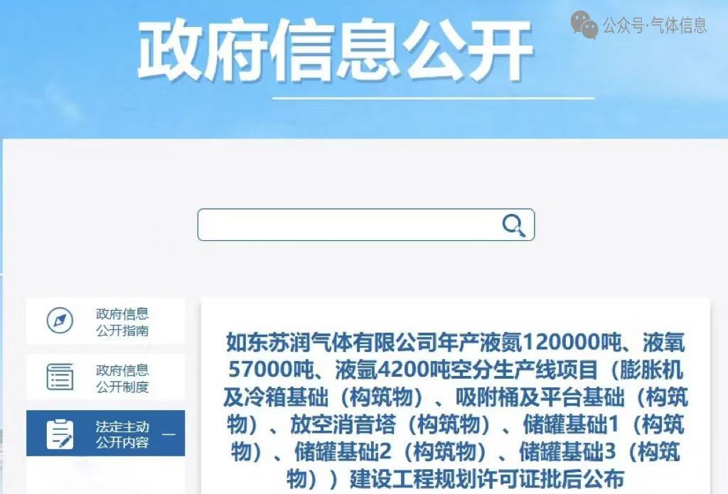 该项目位于江苏省如东县洋口镇,规划年产液氮12万吨、液氧5.7万吨、液氩4200吨,合计液态气体产能近18万吨。作为2023年成立的新兴气体企业,苏润气体此次大手笔投资将显著提升其在华东液态气体市场的供应能力和行业地位,为满足区域工业气体需求提供有力支撑。