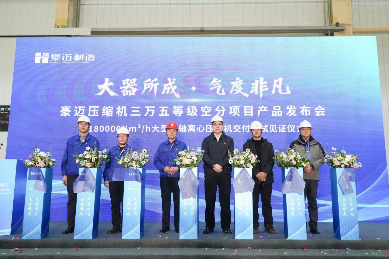 在众人的共同见证下,设备测试交付剪彩仪式顺利举行。并借此契机,豪迈隆重召开了 “大器所成·气度非凡——三万五等级空分项目产品发布会” ,正式将此次交付的成熟机型HM15000及新一代HM15000P优化机型推向市场。通过模拟现场真实工况,进行全压力全流量测试,现场展示的真实测试数据、优异的能效表现以及全透明的一站式服务体验,全面展现了豪迈在研发设计、精密加工、智能装配、精益测试等环节的系统性能力,彰显了国产高端压缩机的真实制造水平与价值承诺。