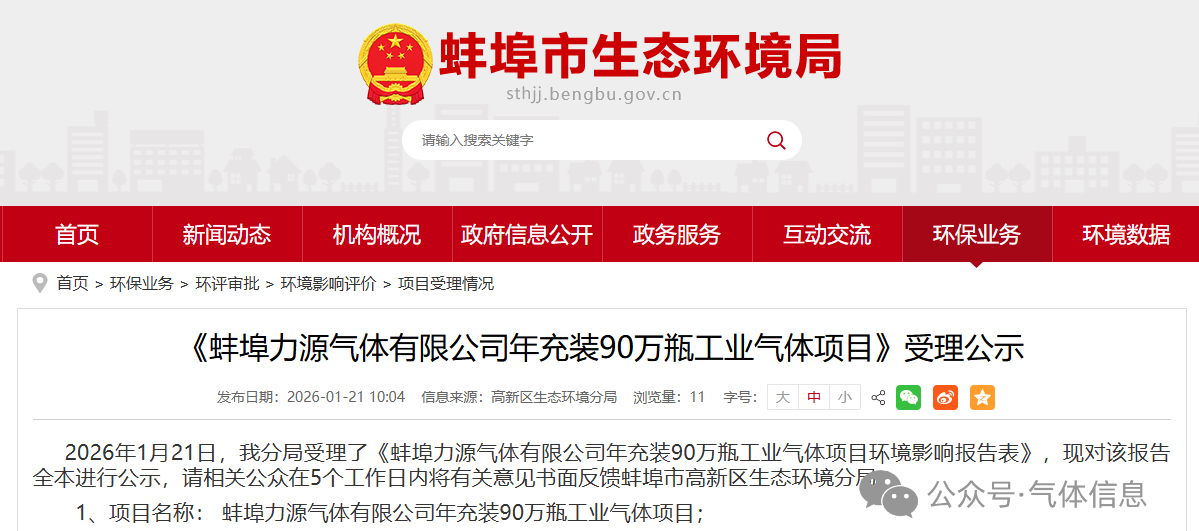 1月21日,蚌埠力源气体有限公司年充装90万瓶工业气体项目受理公示。