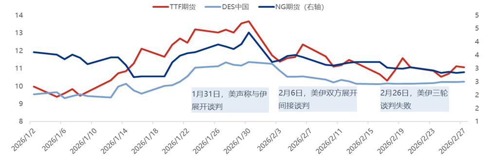 市场对前期对美伊冲突一直持有乐观态度,多数机构预测美伊双方冲突将止步于“桌面”,难以对国际LNG供应及价格产生较强影响,故而在2月内国际LNG价格震荡下行。但冲突发生后,截至2026年3月2日,TTF期货开盘价格为39欧元/MW,涨幅为22.03%,代表东北亚市场变化的JKM收盘价15.068美元/百万英热,环比上涨40.86%,可见市场对于未来LNG供应存在较大担忧。