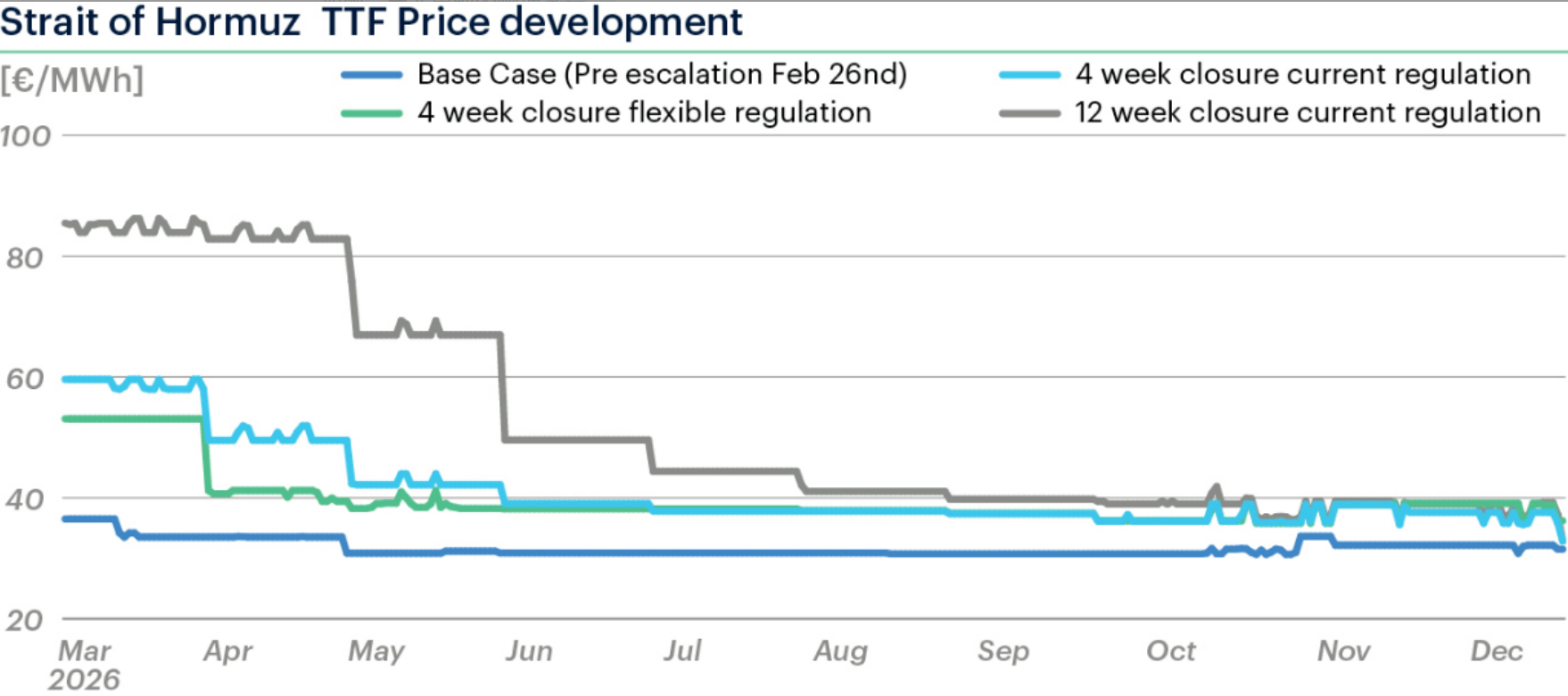 情景1(现行储气规则+封锁4周):3月TTF价格升至约60欧元/兆瓦时;4月回落至40欧元/兆瓦时;5月仍维持在42欧元/兆瓦时高位;整个夏季价格稳定在35-39欧元/兆瓦时,较冲突前远期曲线高出20%。储气库补库需求持续支撑价格。
