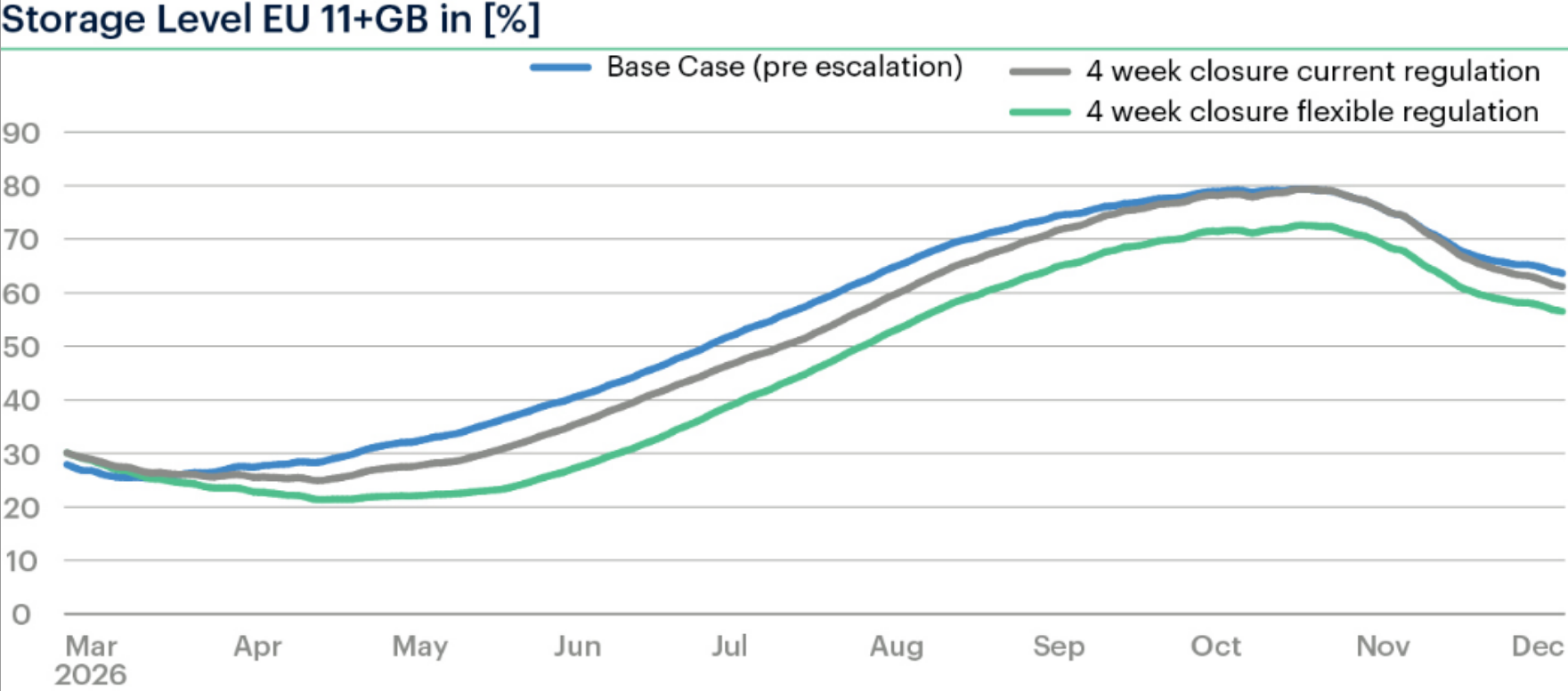 放宽储气规则虽可缓解短期价格峰值,但代价是削弱对下一冬季的战略缓冲能力。模型显示,在放松监管后,西欧与中欧冬末储气水平可能降至约230TWh(库容率约21%),比情景1低近40TWh,较冲突前基线低约45TWh。这意味着短期灵活性换来的是更高的冬季供应短缺风险。