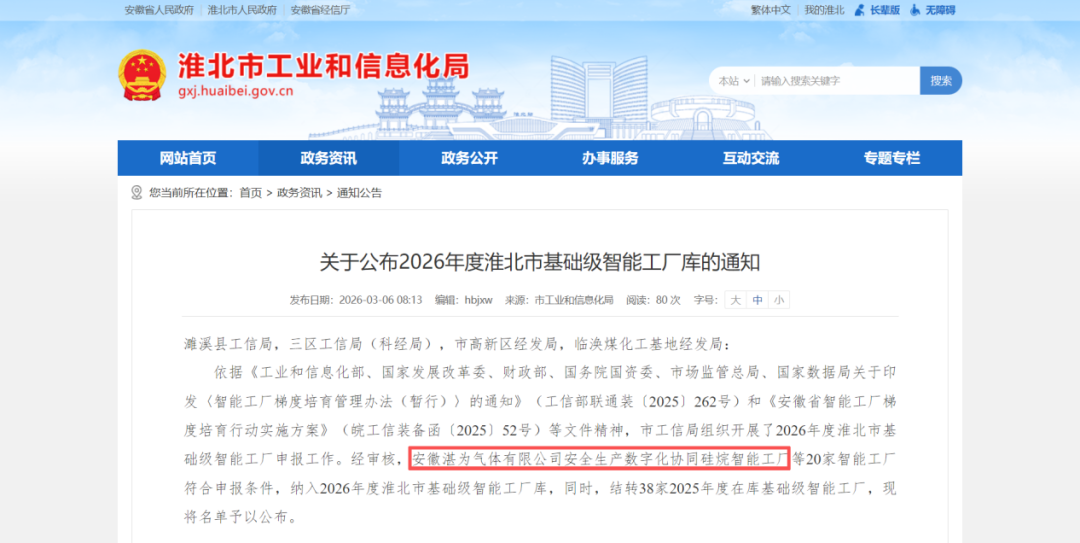 近日,淮北市工业和信息化局公布了2026年度智能工厂名单,华中气体全资子公司—安徽湛为气体有限公司申报的“安全生产数字化协同硅烷智能工厂”,纳入2026年度淮北市智能工厂库。