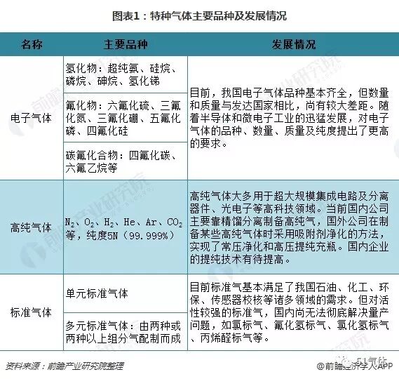 目前,从应用领域划分,特种气体主要有电子气体、高纯气体、标准气体三种,具体品种及发展情况如下。