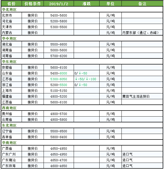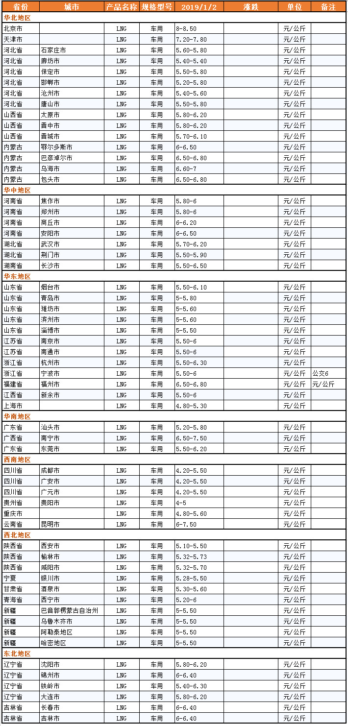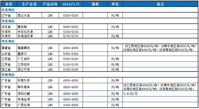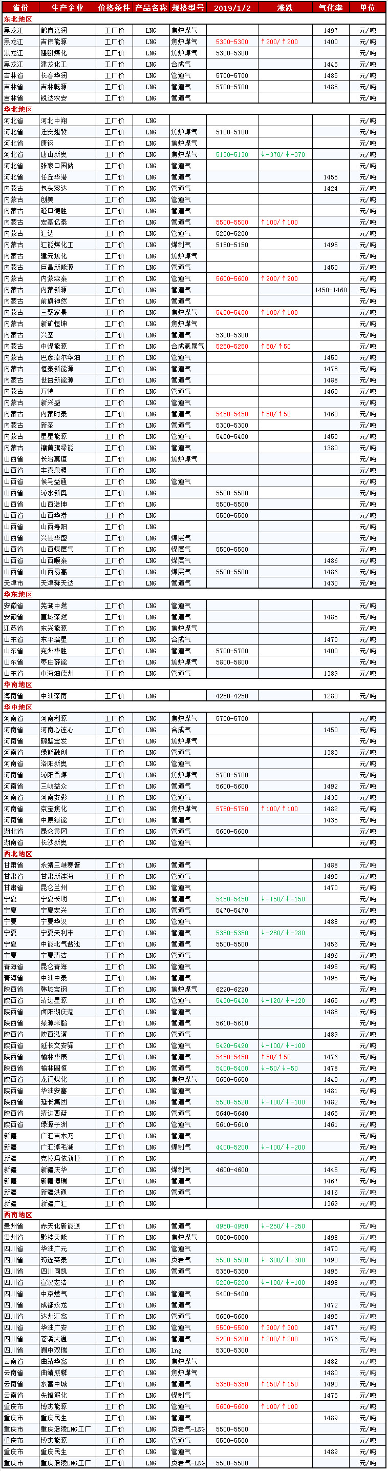 1、行情综述:元旦假期,部分地区高速受限,道路运输不畅,LNG价格开启下行模式,但下行幅度不大,幅度在100-200元/吨左右。据了解,今日起部分接收站价格以稳中下行为主,届时国产气出货将进一步受阻,预计今日陕西、宁夏地区延长价格再度下调100元/吨,短期内市场情况不容乐观。其他地区根据自身情况不同程度调整报价。