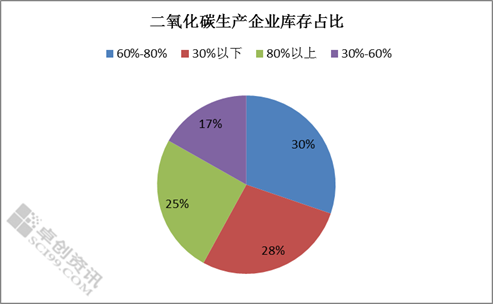 卓创统计数据显示,国内二氧化碳企业库存占比在80%以上的企业占比为25%,库存占比60%-80%的企业占比为30%,库存占比30%-60%的企业占比为17%,库存占比30%以下的企业占比为28%。据卓创了解,春节前后,国内二氧化碳市场下游需求疲软,二氧化碳库存消耗缓慢,目前库存处于中高位的企业数量仍在五成以上。