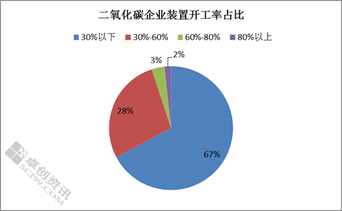 据卓创调查显示,目前开工率在80%以上的企业占比为2%;开工率在60%-80%的企业占比为3%,开工率在30%-60%的企业占比为28%,开工率在30%以下的企业占比为67%。据卓创监测数据显示,近期潜江江汉、徐州金宏、河北凯跃等企业二氧化碳装置已经恢复生产,在一定程度上带动了全国二氧化碳装置开工率的反弹。据卓创了解,沧州仁国、永城国联、科益等二氧化碳企业近期二氧化碳装置亦有重启意向,但考虑到下游需求复苏缓慢及前期库存尚未消耗完毕等因素部分企业将继续维持停工待市的状态。
