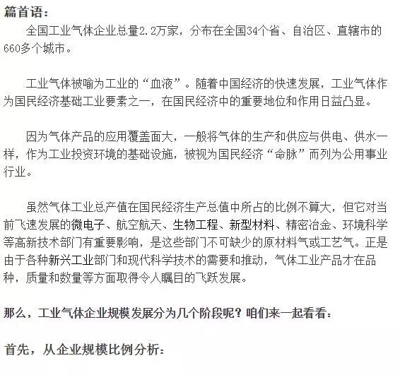全国气体行业按照规模比例分析,小微企业占比超过55%,中小企业占比超过36%。大型企业在全国的比例不超过1.5%。