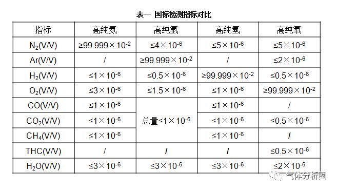 随着现代工业和半导体技术的飞速发展,各行各业对气体纯度的要求越来越高。一般把气体分为大宗气体(Bulk Gas)和特种气体(SpecialGas)两种。大宗气体一般是指集中供应且用量较大的气体,如O2、Ar、H2、He、N2;特种气体则是指那些在特定领域中应用的,对气体有特殊要求的纯气,高纯气或由高纯单质气体配制的二元或多元混合气等,如NF3、SF6、AsH3等。针对不同气体,对其杂质种类和含量有不同要求,如下表所示: