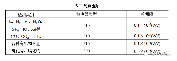 于气体纯度的检测,一般采用配备各种检测器(TCD、FID、DID、FPD、ECD、MSD)的气相色谱仪对气体中的各类杂质进行分析,各杂质所用检测器类型与检出限如表二所示。