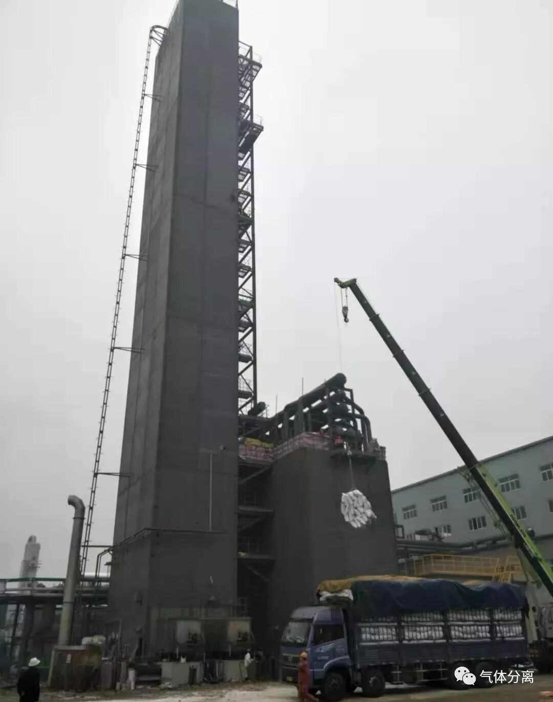 * 湖南常德300T液体空分项目现场冷箱正在吊装就位。该项目于2018年7月成功签订,计划于今年5月底投产。