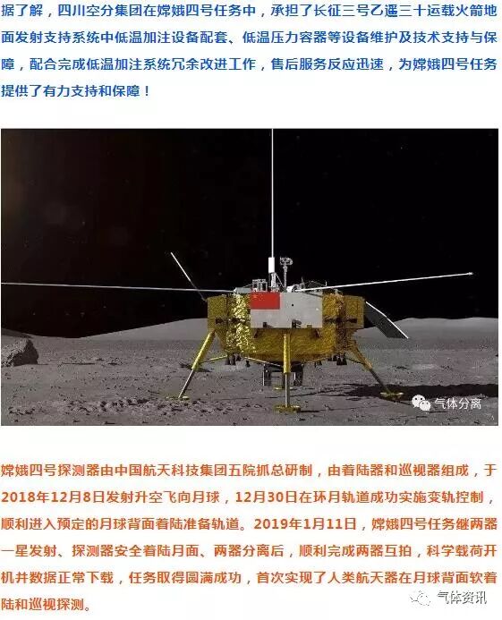 气体分离3月19日,从四川空分集团了解到,探月与航天工程中心给川空集团发来一封感谢信。感谢信称,四川空分在嫦娥四号任务实施过程中,深入贯彻习近平新时代中国特色社会主义思想,大力践行“追逐梦想、勇于探索、协同攻坚、合作共赢”的探月精神;在嫦娥四号任务指挥部的坚强领导下,团结奋战、努力拼搏,为任务的圆满成功做出了突出贡献,特表感谢!