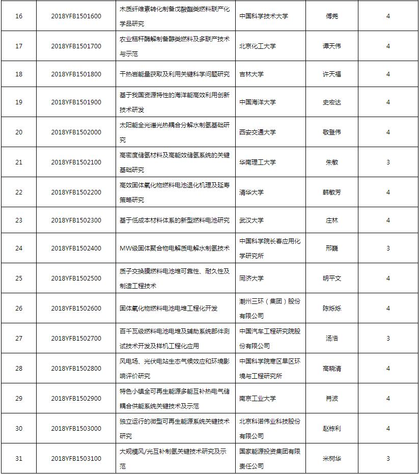 根据《国务院关于改进加强中央财政科研项目和资金管理的若干意见》(国发[2014]11号)、《国务院关于深化中央财政科技计划(专项、基金等)管理改革方案的通知》(国发[2014]64号)、《科技部、财政部关于印发<国家重点研发计划管理暂行办法>的通知》(国科发资[2017]152号)等文件要求,现对“可再生能源与氢能技术”重点专项2018年度拟立项项目信息进行公示(详见附件)。