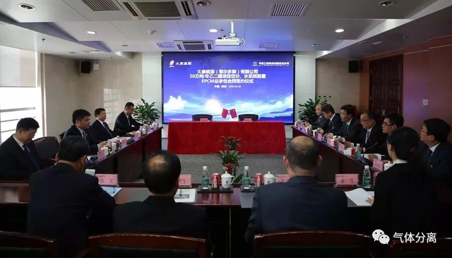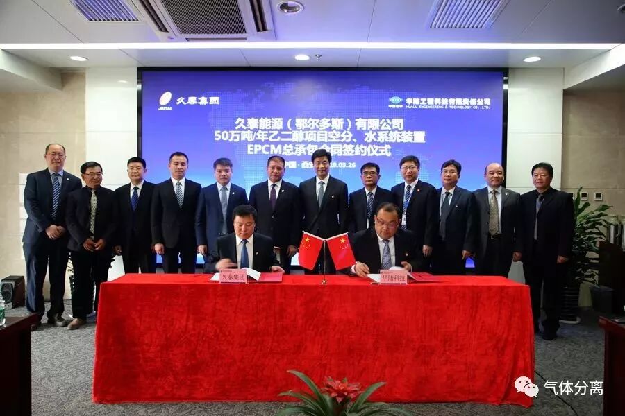 3月26日,久泰能源(鄂尔多斯)有限公司50万吨/年乙二醇项目空分、水系统装置EPCM总承包合同签约仪式在华陆工程科技有限责任公司举行。