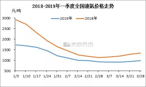 据上图所示,2019年一季度液氩走势与2018年相似,基本呈跌后小涨态势。受春节氛围影响,进入1月,厂商多选择降价排库,以减轻节日期间库存压力。节后,在下游需求尚未大面积开启之前,市场继续以降库存为主,多地价格呈下探态势。其中山东、河北等地降至550元/吨低点,广东跌至1350元/吨左右。直至3月中旬以后,随着天气转暖,需求升温,华东、华中、华南等地价格开启小幅推涨道路。据卓创数据监测, 2019年首季度全国液氩均价为1199元/吨,同比下降28.2%。