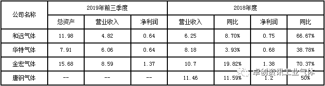 从业绩表现来看,上表所示的四家公司收入等虽不能与林德、空气化工、法液空、盈德、杭氧等巨头相匹敌,但其在中型气体公司中业绩突出,增长势头尤为强劲。根据各公司业绩数据披露,2018年度其营业收入与净利润同比均实现正增长。和远气体总收入6.25亿元,同比增长8.7%,净利润同比增长达66.67%,且根据前三季度数据来看,2019年相关业绩或优于2018年;华特气体营收达8.18亿元,同比增长3.93%,净利润同比增长38.78%,这与其特气客户数量不断增长、供给侧改革下工业气体价格上涨及高纯净系统工程增加等密切相关;金宏气体2018年收入为10.7亿元,同比增长近20%,净利润增长70.37%,涨势强劲,且根据公司预计,2019年其营收或仍可实现8.76%的同比增长;因唐钢气体一直向河钢成员集团的数间成员公司独家供应工业气体,客户优质且供需平稳,2018年其收入为11.46亿元,同比增长11.59%,净利润同比增长50%。