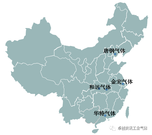 上述四个工业气体公司分别分布在华北、华中、华东及华南等地,且在当地气体贸易中均优势明显。当地的经济特点为其提供了良好的发展环境,但由于各自占据的优势不同,各自经营的产品种类或经营模式各不相同。