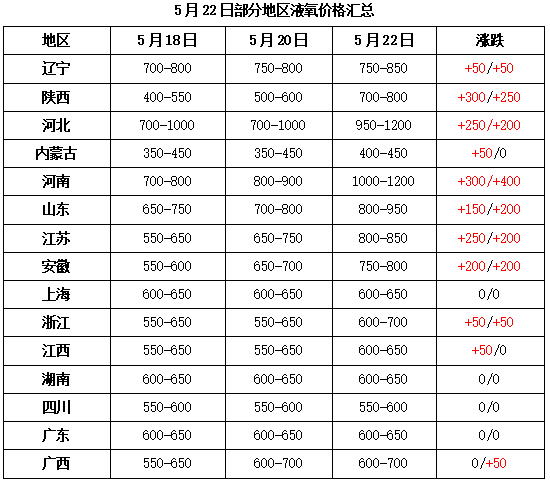 本周华东液氧市场整体表现尚可,受华北地区收货影响,液氧价格均出现不同程度的上调;再加上区域范围内下游制造业需求好转,液氧市场需求量有所增加,价格随之上调。其中山东地区,受河北地区收货影响,价格跟涨,主流市场价格报至800-950元/吨;江苏地区液氧市场表现良好,受周边货源影响,主流市场价格涨至800-850元/吨;安徽地区下游市场表现良好,主流市场价格报至750-800元/吨;上海地区液氧行情平稳,主流市场价格报至600-650元/吨;浙江市场略有震荡调整,主流市场价格报至600-700元/吨;江西地区下游需求放缓,主流市场价格报至600-650元/吨;福建地区液氧行情平稳,主流市场价格报至500-550元/吨。