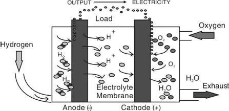 由图1-1可知:燃料(氢气)进入气体通道到达阳极(Anode),在铂催化剂的作用下,发生阳极反应: