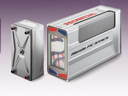 Honda FCX Clarity采用了Honda新开发的新一代的小型轻量化燃料电池堆“V Flow FC Stack”,采用金属冲压隔片构造,一概以往的用螺母固定碳素分隔片的复杂结构,将所用的部件数量减少为原来的1/2,功率密度却提高了两倍以上,达到了世界一流的高性能水平【3】。同时,由于采用了新开发的芳香型电解质膜,大大提高了电池系统的可靠性与耐用度。Honda同时采用了Honda独创的氢气和空气竖直流动的“V Flow电池单元构造”,并且采用使氢气和空气波状流动的“波状隔板”,和上一代产品相比相比,性能有了飞跃性提高,并实现了轻质化和小型化。新型燃料电池堆的最高功率提升至100kW,与上一代燃料电池堆相比,体积功率密度提高50%,重量功率密度提高67%。低温启动性能的提升使得燃料电池可以在零下30摄氏度的环境下正常工作。