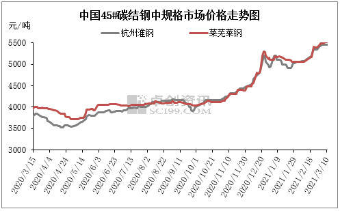 今日国内45#碳结钢价格稳中趋弱,现货市场部分资源再度下跌10-50元/吨不等,如东方特钢45#25-85mm直发5320元/吨,杭州市场杭钢资源已现低价5300元/吨,“落袋为安”成为多数钢贸商目前的主操作。不过,尽管近几日部分资源市价有所下降,但目前45#碳结钢价格仍处于10年来高点位置,如目前淮钢45#29-55mm碳结钢市价5450-5470元/吨,在10年间大“W”型行情中,2017年12月高点5080元/吨,高出了380元/吨。