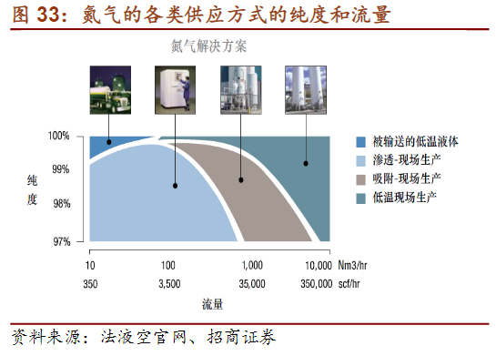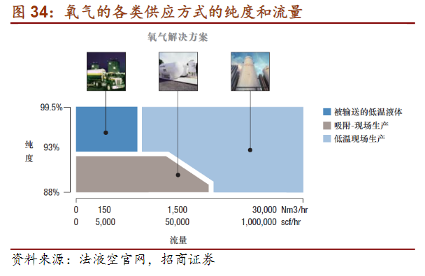 一般来说,和客户公司签订供气合同并投产后,除现场制气外多产生的产品,可通过液体罐槽运送到临近区域不需要集中供气的电子、化工、机械等中小客户,需求更加分散的如医用氧气瓶往往会通过瓶装气的形式销售。根据法液空的业务介绍,输送的低温液体一般生产流量较低,但纯度更高,而现场制气中的吸附、渗透和低温制气的纯度区别不大,但低温现场制气的生产流量极高