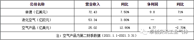 林德第一季度营业收入为72.43亿美元,同比增长7.5%,净利润实现9.8亿美元,同比大幅增长71%。主要是随着经济回暖,医疗健康、电子及其他相关终端行业需求向好导致气体的销量和定价均有提升。